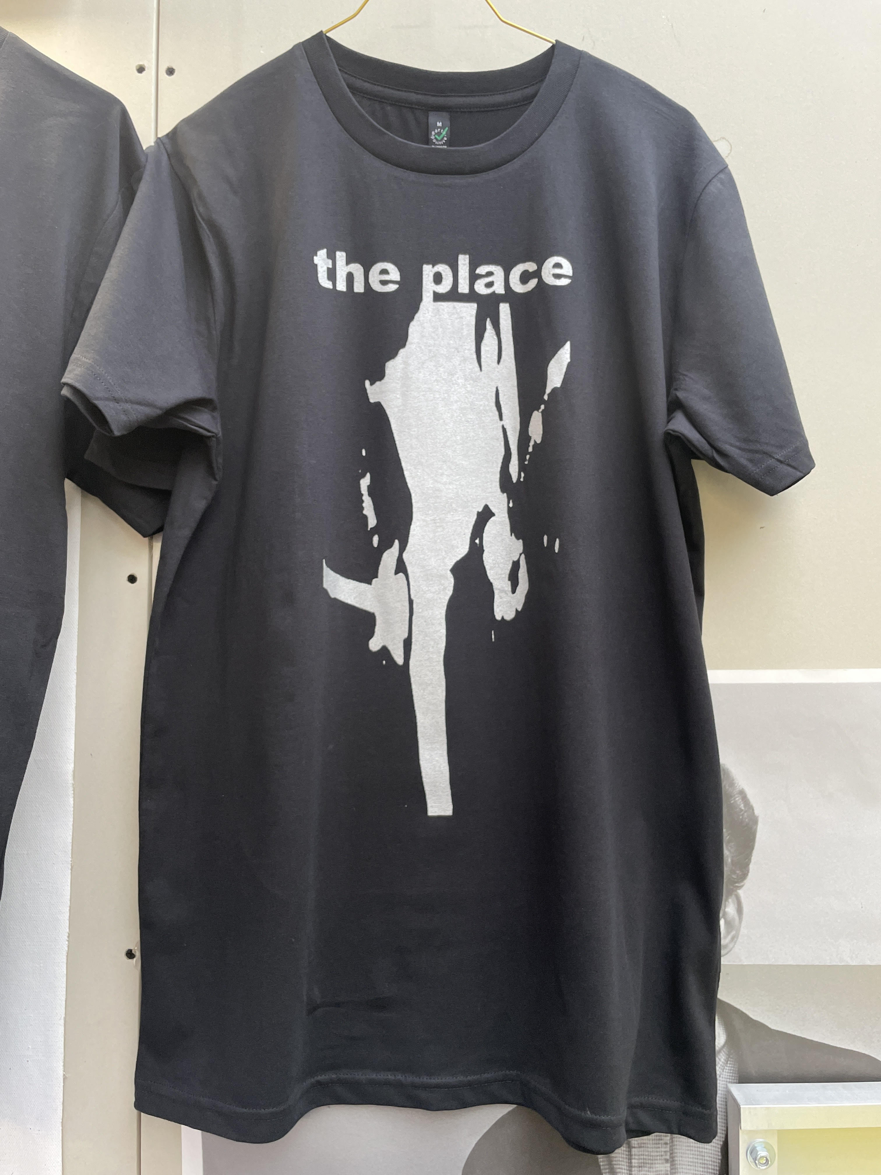 The Place t-shirt. Silver ink Screen-print on black organic cotton t-shirt. Sizes XS/S/M/L/XL. £25.00 + p+p